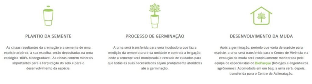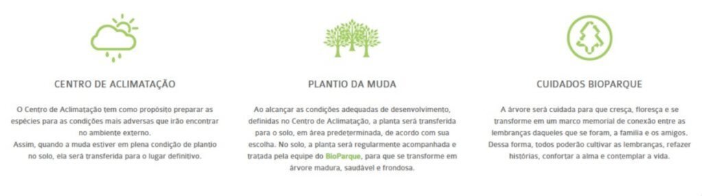 O BioParque propõe transformar as cinzas do ente querido em parte de um substrato preparado para o plantio de árvores. A espécie é escolhida por quem presta a homenagem, mas já são pré-selecionadas de acordo com a flora e fauna locais.