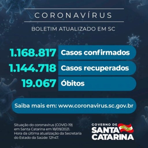 Santa Catarina tem 1.168.817 casos confirmados de infecção pelo novo coronavírus, sendo que 1.144.718 estão recuperados e 5.032 continuam em acompanhamento. O balanço foi divulgado neste sábado, 18. Desde o início da pandemia, 19.067 óbitos foram causados pela doença respiratória. A taxa de letalidade é de 1,63%.