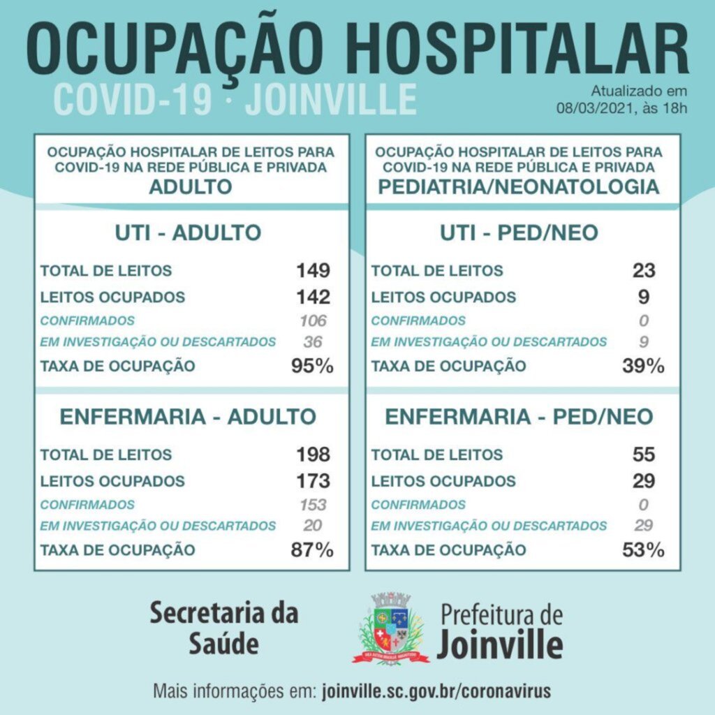 Nesta segunda-feira (8/3), Joinville alcançou o total de 62.945 casos de Covid-19 confirmados. Os recuperados somam 58.447 e, dos confirmados, 259 estão internados, 3.481 em isolamento domiciliar e 758 perderam a vida.