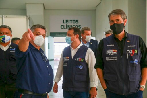 O governador Carlos Moisés acompanhou na tarde desta sexta-feira, 5, a visita do ministro da Saúde, Eduardo Pazuello, a Chapecó, no Oeste do Estado. Acompanhados do prefeito João Rodrigues, as autoridades visitaram a UPA da cidade, que tem pacientes internados com Covid-19, e em seguida se deslocaram para o Centro de Eventos Plínio Arlindo de Nes.