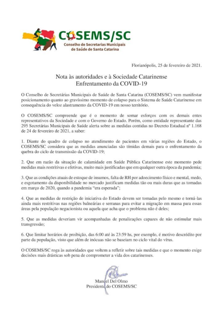 "Em razão da situação de calamidade em Saúde Pública este momento pede medidas mais restritivas e efetivas, muito mais justificadas que em qualquer outra época da pandemia", diz nota publicada pelo Conselho de Secretariais Municipais de Saúde de SC (Cosems/SC) nesta quinta-feira (25) e assinada pelo presidente da entidade, Manuel Del Olmo.