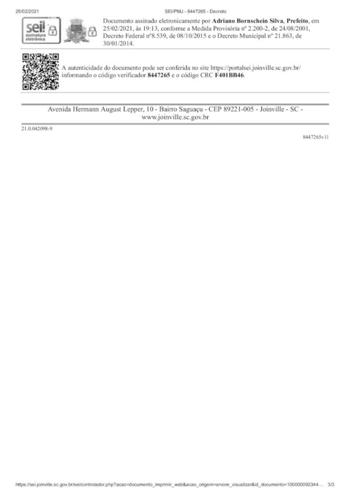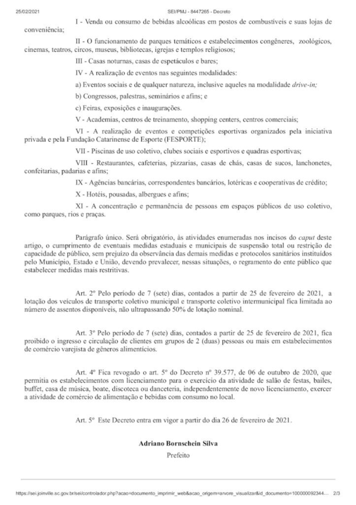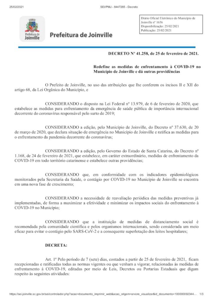 Nesta quinta-feira (25), a prefeitura de Joinville publicou o decreto 41.258, com o objetivo de conter o avanço da pandemia de Covid-19, fornecendo as condições necessárias para que a capacidade da rede de saúde continue sendo suficiente para atender a demanda da cidade.