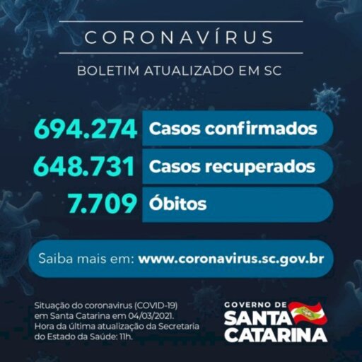 SC: Estado confirma 694.274 casos, 648.731 recuperados e 7.709 mortes