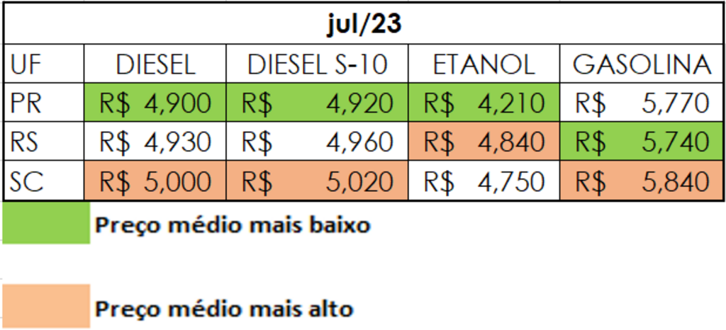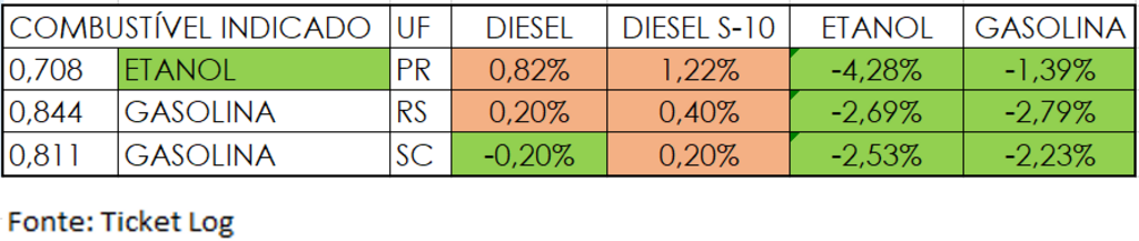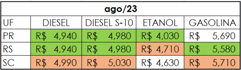De acordo com dados da última análise do Índice de Preços Ticket Log (IPTL), levantamento que consolida o comportamento de preços das transações nos postos de combustível, trazendo uma média precisa, na primeira quinzena de agosto o preço médio do litro do diesel comum aumentou 0,41% e fechou a quinzena a R$ 4,95, enquanto o tipo S-10 apresentou acréscimo de 1,01% na região e foi comercializado a R$ 5,00, as médias mais baixas do País. O etanol reduziu 4,08% na Região Sul, ante julho, e foi comercializado a R$ 4,23. Já a gasolina fechou a R$ 5,65, com redução de 2,08% se comparado ao mês anterior.