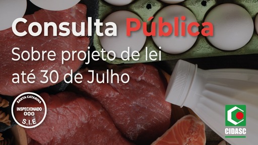 O Projeto de Lei permanecerá em consulta pública até o dia 30 de julho de 2023. O texto está disponível na sessão do site da Cidasc dedicada à Inspeção de Produtos de Origem Animal e pode ser acessado diretamente no link (LINK). A Cidasc espera receber contribuições do setor produtivo e demais interessados para aprimorar a proposta, observando sempre a adequação às demais legislações existentes.