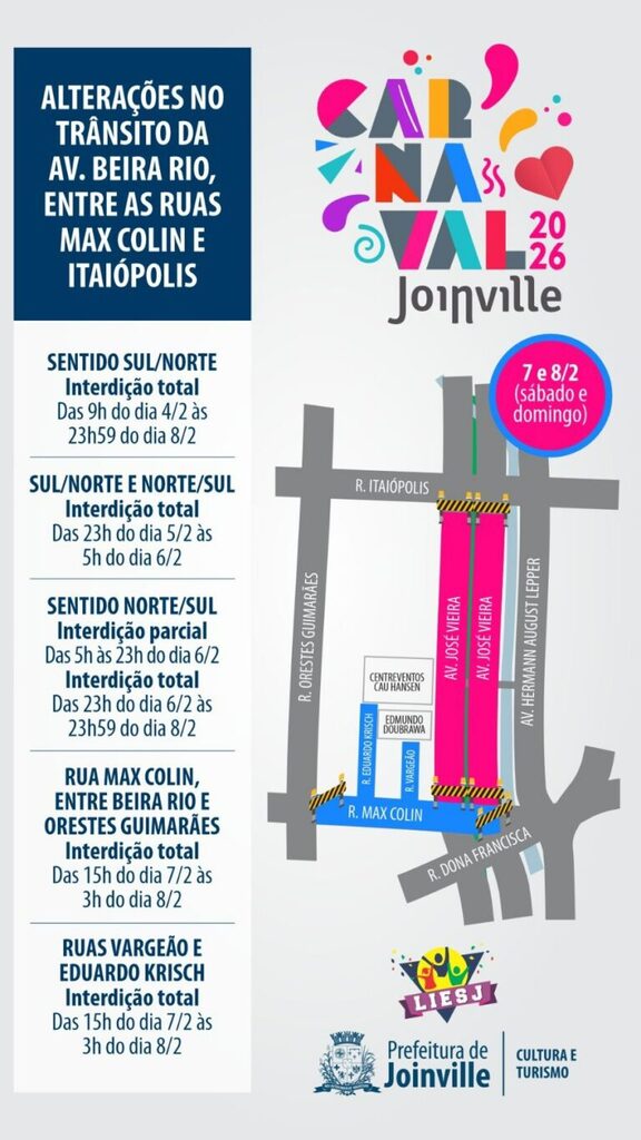 Carnaval de Joinville altera trânsito na avenida Beira Rio a partir de quarta-feira