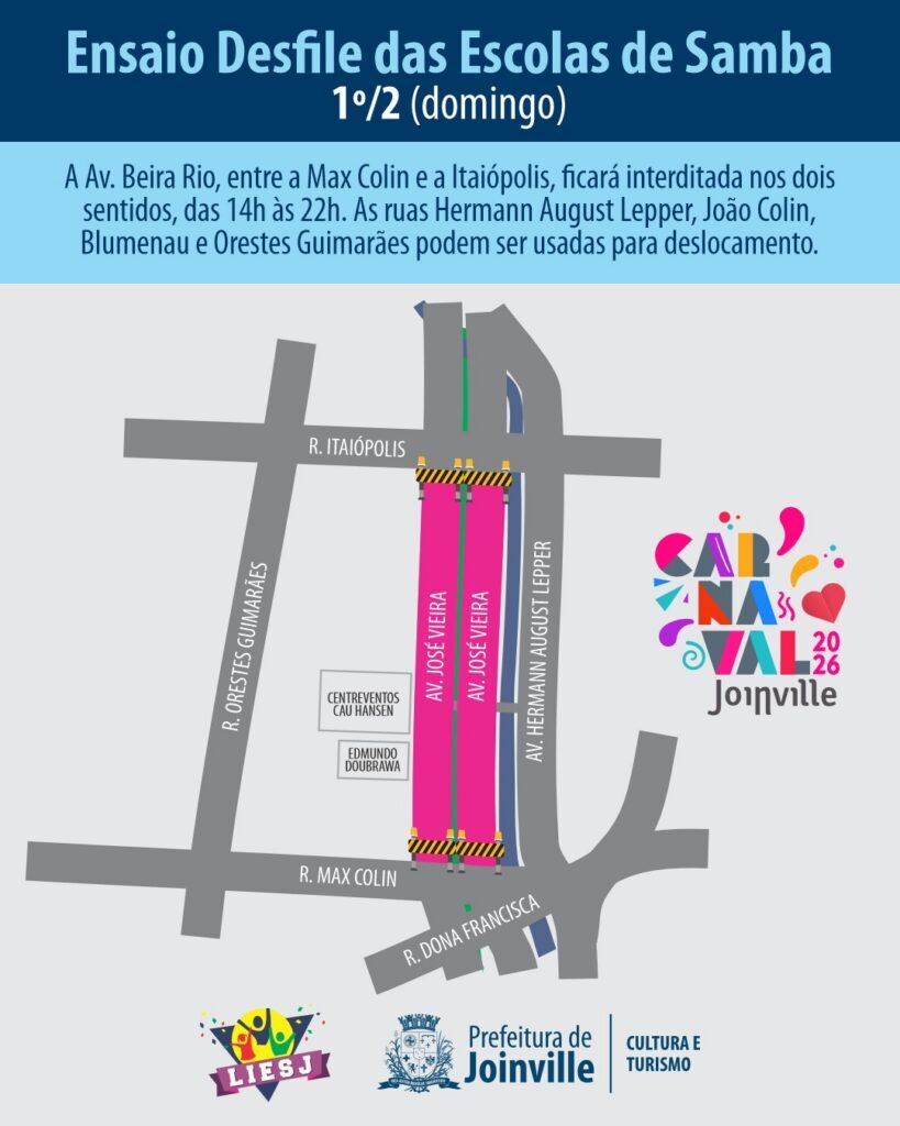 O ensaio técnico para o Desfile das Escolas de Samba promete agitar a avenida Beira Rio neste domingo (2), marcando a reta final dos preparativos para o Carnaval de Joinville. Por conta do evento, que começa às 16h, a via terá interdições temporárias no trânsito.