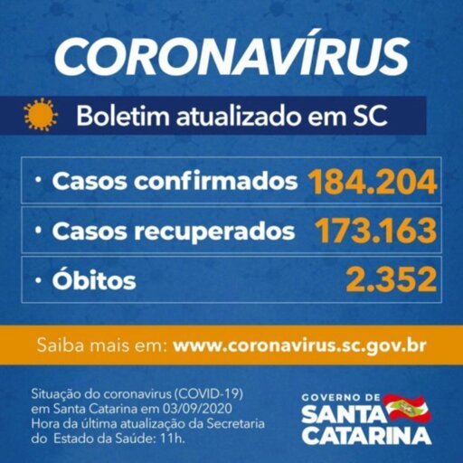 O Governo do Estado informou que há 184.204 pacientes com teste positivo para Covid-19. Desses, 173.163 são considerados recuperados e 8.689 continuam em acompanhamento. O dado foi divulgado nesta quinta-feira, 3. O novo coronavírus causou 2.352 óbitos no estado desde o início da pandemia. Com isso, a taxa de letalidade é de 1,28%. Já foram confirmados casos em todos os 295 municípios catarinenses e 215 cidades registraram pelo menos um óbito. A cidade com a maior quantidade de confirmações de infecção pelo novo coronavírus é Joinville, com 17.207 casos. Em seguida, estão Florianópolis (11.423), Blumenau (10.576), Balneário Camboriú (6.784), Itajaí (6.627), São José (5.917), Chapecó (5.914), Criciúma (5.895), Palhoça (5.333) e Brusque (4.817). A taxa de ocupação dos leitos de UTI pelo Sistema Único de Saúde (SUS) em Santa Catarina é de 69,8%. Isso significa que, dos 1.522 leitos existentes no estado, 459 estão livres e 1.063 estão ocupados, sendo 430 por pacientes com confirmação ou suspeita de infecção por coronavírus.