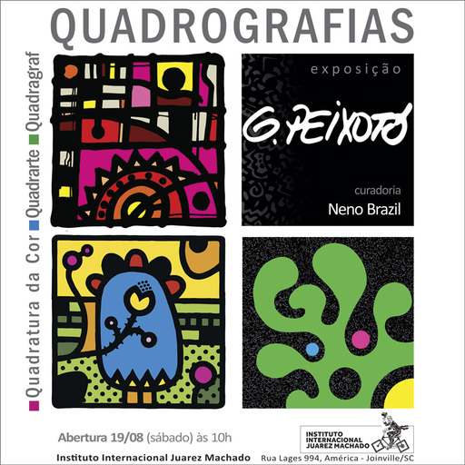 Em três de suas últimas séries o artista George Peixoto optou pelo quadrado como sua janela estética ou como formato de seus trabalhos. Combinando elementos de arte abstrata com traços e cores definidores, estamparia, Pop Art, HQ e outras linguagens contemporâneas, uma seleção de obras digitais, coloridas, bicolores ou P&B, dessas três séries constituem o corpo da exposição que o Instituto Internacional Juarez Machado apresenta com curadoria de Neno Brazil.