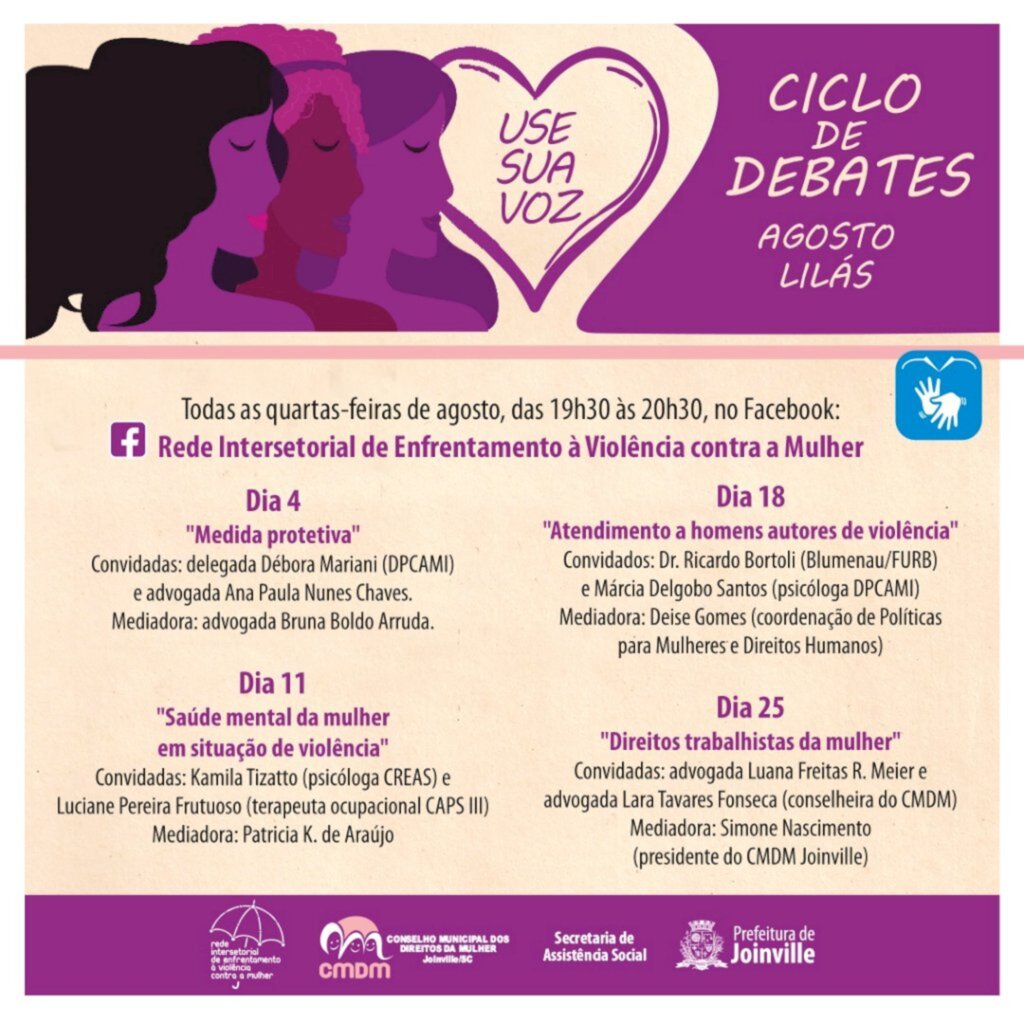 A Rede Intersetorial de Enfrentamento à Violência Contra a Mulher, em parceria com o Conselho Municipal dos Direitos da Mulher de Joinville e a Secretaria de Assistência Social realiza um ciclo de debates no Agosto Lilás, mês de conscientização e combate a violência contra a mulher. Todas as quartas-feiras deste mês, um tema diferente vai ser debatido no Facebook da Rede Intersetorial. Os debates são abertos a todos.