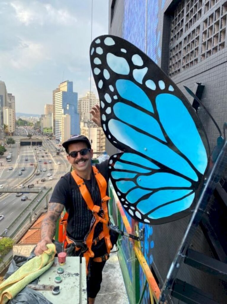 Foto: arquivo pessoal/ Mena instalando borboleta