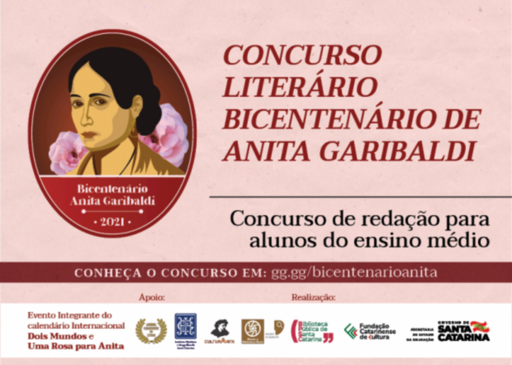 Estão abertas as inscrições para o Concurso Literário Bicentenário de Anita Garibaldi que tem o intuito de divulgar a memória e o legado de Anita Garibaldi no meio escolar, além de incentivar a produção literária e a leitura. Poderão participar estudantes de Ensino Médio da Rede Estadual. O concurso é coordenado pela Biblioteca Pública de Santa Catarina, espaço administrado pela Fundação Catarinense de Cultura (FCC), em parceria com a Secretaria de Estado da Educação e apoio da Academia Catarinense de Letras e Instituto Histórico e Geográfico de Santa Catarina.