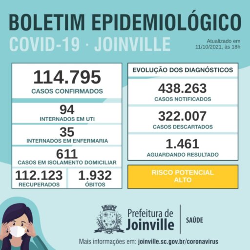 Em novo boletim nesta segunda-feira (11/10), a Secretaria da Saúde de Joinville confirmou 114.795 no total de casos de Covid-19 desde o início da pandemia. Os recuperados agora somam 112.123 e, dos confirmados, 129 estão internados, 611 em isolamento domiciliar e 1.932 perderam a vida. Já foram realizados 438.263 exames, com 322.007 descartados e 1.461 aguardando resultado.