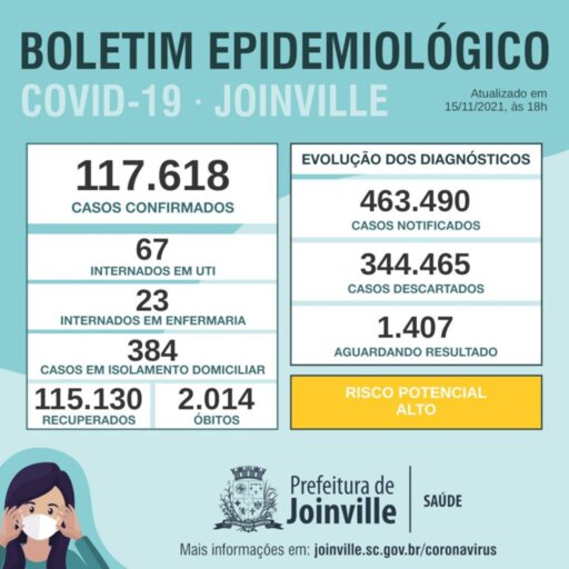 Em novo boletim nesta segunda-feira (15/11), a Secretaria da Saúde de Joinville confirmou 117.618 no total de casos de Covid-19 desde o início da pandemia. Os recuperados agora somam 115.130 e, dos confirmados, 90 estão internados, 384 em isolamento domiciliar e 2.014 perderam a vida.
