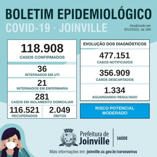 Em novo boletim nesta quinta-feira (9/12), a Secretaria da Saúde de Joinville confirmou 118.908 no total de casos positivos de Covid-19 desde o início da pandemia. Os recuperados agora somam 116.521 e, dos confirmados, 57 estão internados, 281 em isolamento domiciliar e 2.049 perderam a vida.