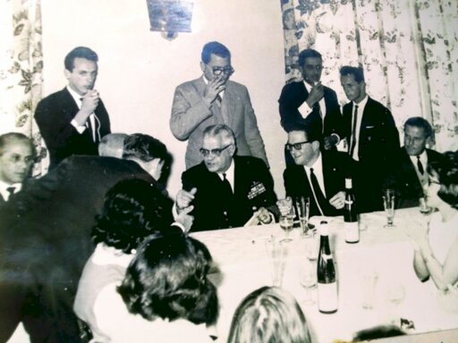 Visita do almirante Sílvio Heck, um dos líderes da corrente militar que ficou conhecida por "linha dura" no início do regime militar implantado em 1964. O grupo de militares assim identificado defendia o aprofundamento e a manutenção do regime por longo tempo, inicialmente durante o primeiro governo militar (1964-1967). A recepção ao militar aconteceu no Tênis Cube Boa Vista, na rua Aubé. O almirante está sentado à esquerda, seguido de Hans Dieter Schmidt, diretor-presidente da Fundição Tupy e presidente da ACIJ - Associação Comercial e Industrial de Joinville; ao seu lado está o prefeito Helmut Fallgatter.Os repórteres são: da esquerda p/ a direita - Ary Silveira de Souza (Rádio Difusora), Juca Wetzel (Correio da Tupy), Tito Corrêa Rádio Colon) e Heinz Ziemmer(Jornal de Joinville). Foto: Departamento de Relações Públicas da Fundição Tupy - relato do jornalista Ary Silveira de Souza, presente ao evento.