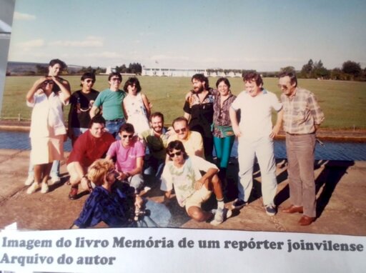 Integraram o grupo: Toninho Neves, Luiz Veríssimo, Tusi Helena, Fernando Pinto Júnior, Ismael Pepper, Osni Martins, Ari Lazzari, Ary Silveira de Souza, entre outros - ao fundo o Palácio da Alvorada - Foto do livro Memórias de um repórter joinvilense/2018.