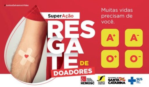 O Centro de Hematologia e Hemoterapia de Santa Catarina (Hemosc), lançou, nesta segunda-feira, 16, mais uma campanha para estimular a doação de sangue. Com o slogan "SuperAção Resgate de Doadores", a estratégia visa a resgatar os doadores de sangue que não retornam para doação desde 2008. O foco da campanha são os doadores com as tipagens A e O, positivos e negativos, que são as de maior frequência na população e, portanto, as de maior consumo. A ação será realizada em todas as unidades da rede.