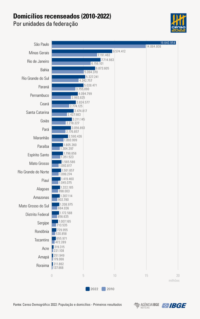 Em 2022, havia 90,7 milhões de domicílios no país, um aumento de 34% frente ao Censo 2010, quando existiam 67,5 milhões. Dos recenseados em 2022, 90,5 milhões eram domicílios particulares permanentes e 72,4 milhões estavam ocupados durante a operação censitária, um aumento de 26% no mesmo período. Os domicílios improvisados somaram 66 mil e os coletivos, 105 mil. Os dados divulgados hoje (28) pelo IBGE fazem parte dos primeiros resultados do Censo Demográfico 2022.