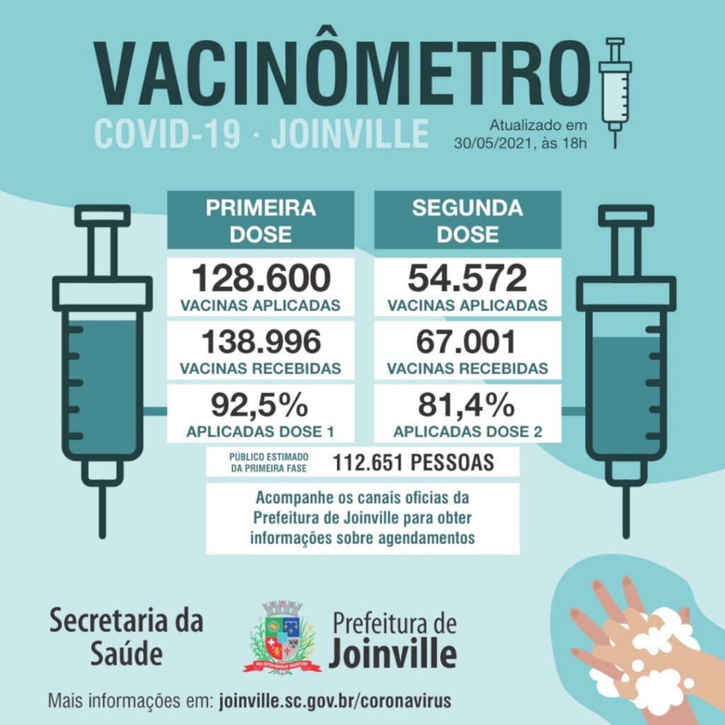 A Secretaria da Saúde também informou que já foram aplicadas o total de 128.600 primeiras doses e 54.572 segundas doses. As informações completas podem ser conferidas no Vacinômetro.