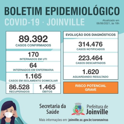 Neste domingo (6/6), a Secretaria da Saúde de Joinville confirmou 89.392 no total de casos de Covid-19 o início da pandemia. Os recuperados agora somam 86.528 e, dos confirmados, 234 estão internados, 1.165 em isolamento domiciliar e 1.465 perderam a vida.