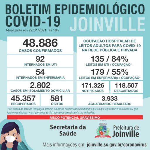 A semana encerra com a confirmação de mais 265 casos positivos e um total de 48.886 desde o início da pandemia. Os recuperados agora somam 45.357 e 581 perderam a vida. Já foram realizados 171.326 exames, com 118.507 descartados e 3.933 aguardando resultado.Mais seis pessoas perderam a vida: cinco homens, de 38, 54, 60, 61 e 75 anos e uma mulher de 60 anos. Esses óbitos são referentes aos resultados de exames que saíram nos últimos dois dias.