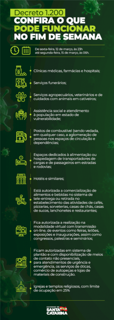 Entra em vigor nesta sexta-feira, 12, o decreto 1.200, do Governo do Estado, com regras e medidas de enfrentamento à Covid-19. Para o fim de semana, haverá mais restrições, elas são válidas a partir das 23h desta sexta até as 6h da próxima segunda-feira, 15. Durante a próxima semana também estão especificadas regras para o funcionamento de atividades, com limites de horário e ocupação.