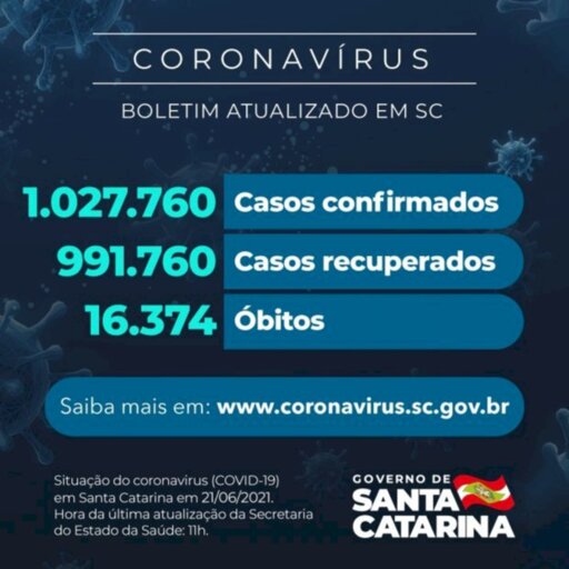O Governo do Estado relatou que há 1.027.760 casos confirmados de Covid-19 em Santa Catarina, sendo que 991.760 estão recuperados e 19.626 continuam em acompanhamento. O dado foi divulgado nesta segunda-feira, 21. O novo coronavírus causou 16.374 mortes no estado desde o início da pandemia. Com isso, a taxa de letalidade é de 1,59%.