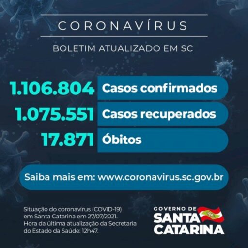 Em comparação com o último boletim, houve mais 49 óbitos registrados. Aos casos confirmados se somaram 2.350, enquanto a estimativa de recuperados aumentou 2.028. Registrou-se um aumento de 273 no número de casos ativos.O Governo do Estado estima que haja 281 municípios com casos ativos. Considerando dados proporcionais à população, a regional com a maior quantidade de casos ativos atualmente é a da Foz do Rio Itajaí (288 para cada 100 mil habitantes). Na sequência, aparecem Alto Vale do Itajaí (247) e Nordeste (224).