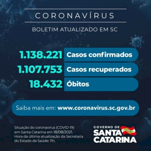Santa Catarina chegou a 1.138.221 casos confirmados de infecção pelo novo coronavírus, sendo que 1.107.753 estão recuperados e 12.036 continuam em acompanhamento. O balanço foi divulgado nesta quarta-feira, 18. Desde o início da pandemia, 18.432 óbitos foram causados pela doença respiratória. A taxa de letalidade atual é de 1,62%.