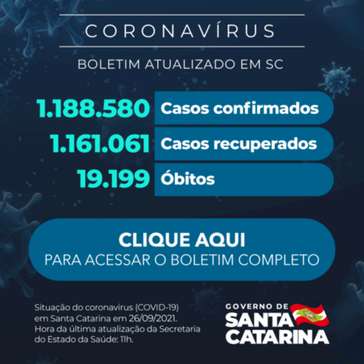 Há, em Santa Catarina, 1.188.580 pacientes com confirmação de infecção pelo novo coronavírus, dos quais 1.161.061 estão recuperados e 8.320 permanecem em acompanhamento. O dado foi divulgado neste domingo, 26. Desde o início da pandemia, 19.199 mortes foram causadas pela Covid-19. Esses números colocam a taxa de letalidade em 1,62%.