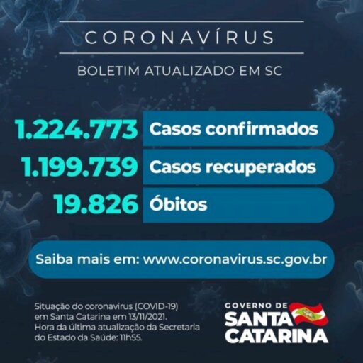 Há, em Santa Catarina, 1.224.773 pacientes com confirmação de infecção pelo novo coronavírus, sendo que 1.199.739 se recuperaram e 5.208 estão em acompanhamento. O dado foi divulgado neste sábado, 13. Desde o início da pandemia, 19.826 óbitos foram causados pela doença respiratória. Esses números colocam a taxa de letalidade em 1,62%.