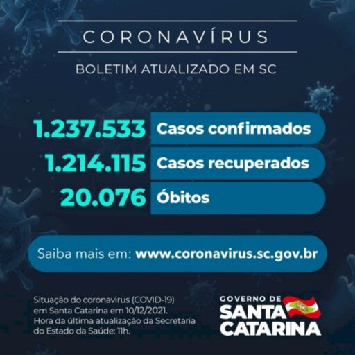 ?Santa Catarina já registrou 1.237.533 pacientes com confirmação de infecção pelo novo coronavírus, sendo que 1.214.115 se recuperaram e 3.342 estão em acompanhamento. O balanço foi divulgado nesta sexta-feira, 10. A Covid-19 causou 20.076 óbitos no estado desde o início da pandemia. Esses números colocam a taxa de letalidade em 1,62%.