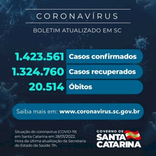 Há 1.423.561 casos confirmados de infecção pelo novo coronavírus em Santa Catarina, dos quais 1.324.760 estão recuperados e 78.287 permanecem em acompanhamento. O dado foi divulgado nesta sexta-feira, 28. A doença respiratória causou 20.514 óbitos no estado desde o início da pandemia. A taxa de letalidade atual é de 1,44%.