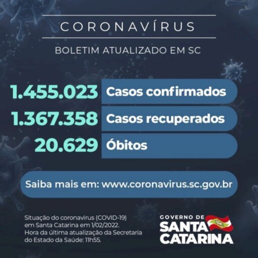 Coronavírus em SC: Estado confirma 1.455.023 casos, 1.367.358 recuperados e 20.629 mortes