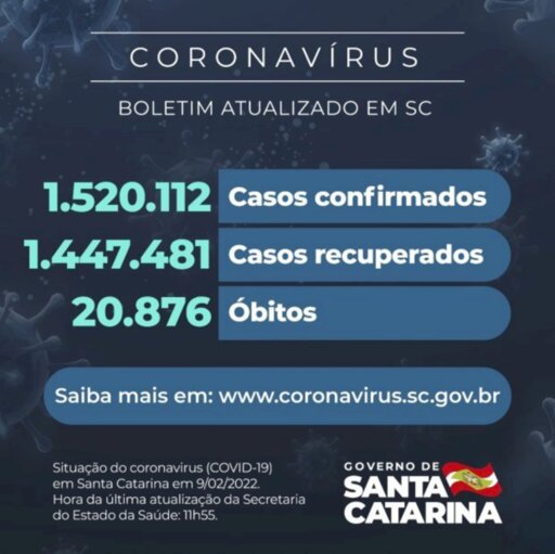 Há 1.520.112 casos confirmados de Covid-19 em Santa Catarina, sendo que 1.447.481 se recuperaram e 51.755 estão em acompanhamento. O número foi divulgado nesta quarta-feira, 9. Desde o início da pandemia, 20.876 óbitos foram causados pelo coronavírus. Com isso, a taxa de letalidade é de 1,37%.
