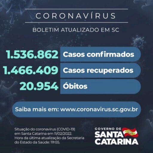 O Governo do Estado relatou que há um total de 1.536.862 casos confirmados de infecção pelo novo coronavírus em Santa Catarina, dos quais 1.466.409 estão recuperados e 49.499 permanecem em acompanhamento. O dado foi divulgado nesta sexta-feira, 11. Desde o início da pandemia, 20.954 óbitos foram causados pela doença respiratória. A taxa de letalidade atual é de 1,36%.