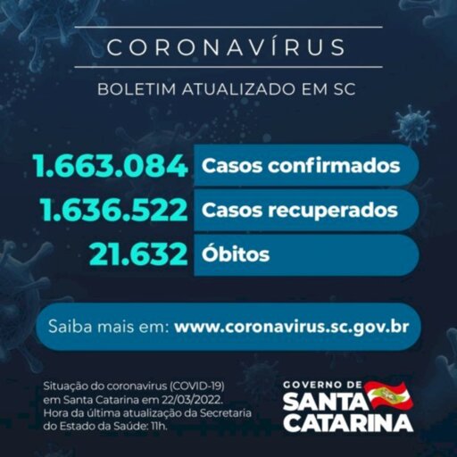 O Governo do Estado informou que há 1.663.084 pacientes com teste positivo para Covid-19 em Santa Catarina, sendo que 1.636.522 estão recuperados e 4.930 continuam em acompanhamento. O dado foi divulgado nesta terça-feira, 22. Desde o início da pandemia, 21.632 óbitos foram causados pelo coronavírus. Esses números colocam a taxa de letalidade em 1,3%.