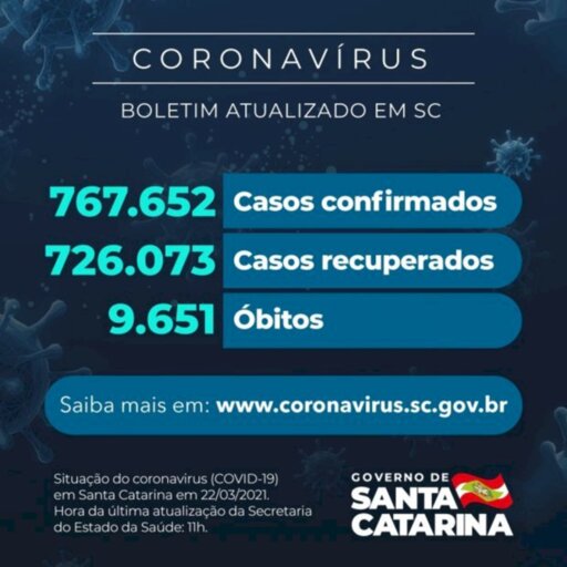 Santa Catarina tem 767.652 casos confirmados de infecção pelo novo coronavírus, sendo que 726.073 se recuperaram e 31.928 estão em acompanhamento. O dado foi divulgado nesta segunda-feira, 22. A doença respiratória causou 9.651 óbitos no estado desde o início da pandemia. A taxa de letalidade atual é de 1,26%.