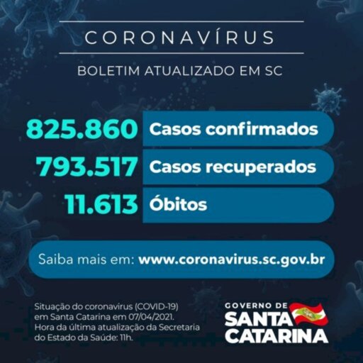 Há 825.860 casos confirmados de infecção pelo novo coronavírus em Santa Catarina, sendo que 793.517 estão recuperados e 20.730 continuam em acompanhamento. O dado foi divulgado nesta quarta-feira, 6. A Covid-19 causou 11.613 mortes no estado desde o início da pandemia. A taxa de letalidade é de 1,3%.