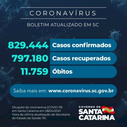 Coronavírus em SC: Estado confirma 829.444 casos, 797.180 recuperados e 11.759 mortes