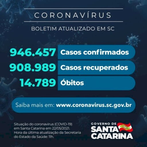 O Governo do Estado relatou que há um total de 946.457 casos confirmados de Covid-19 em Santa Catarina, dos quais 908.989 estão recuperados e 22.679 permanecem em acompanhamento. O dado foi divulgado neste sábado, 22. O novo coronavírus causou 14.789 óbitos no estado até esta data. A taxa de letalidade é de 1,56%.