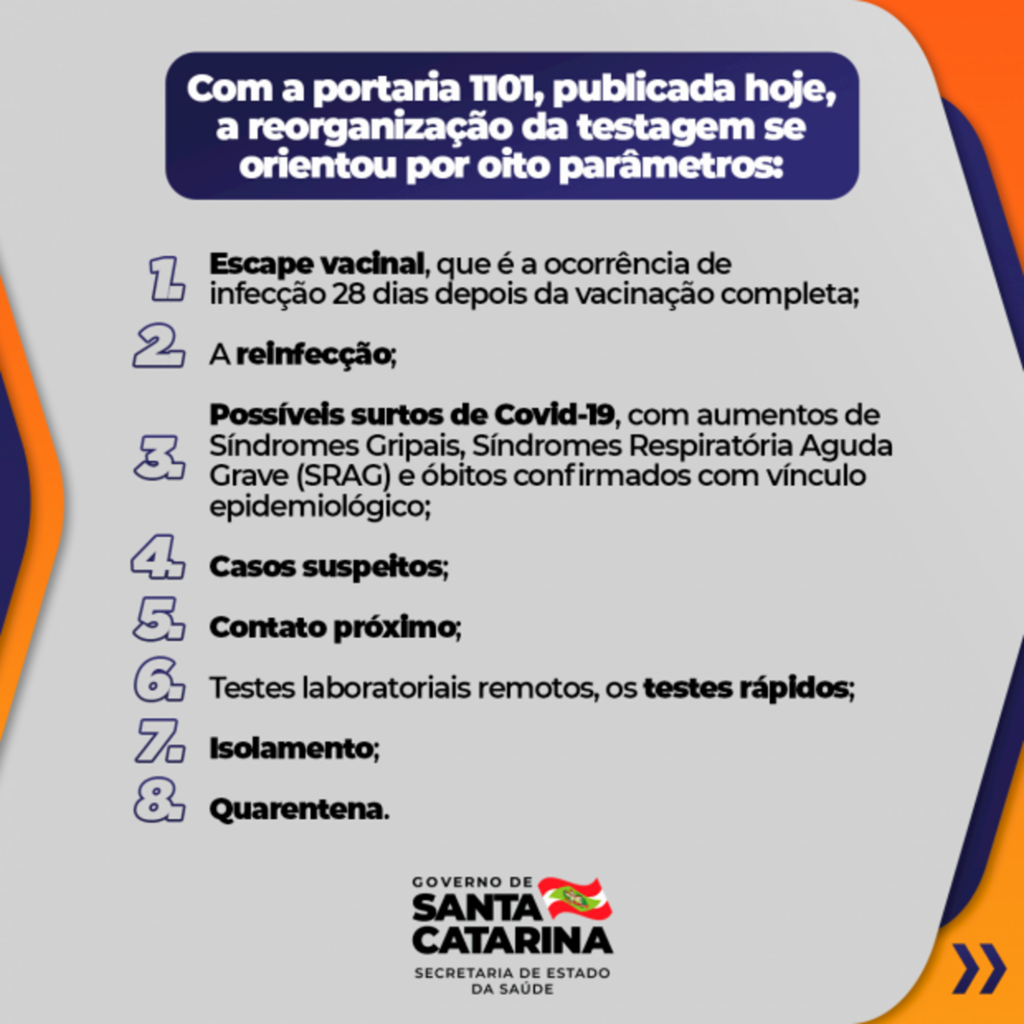 Na segunda-feira, 11, o Diário Oficial do Estado publica a portaria SES 1101, que servirá para reorganizar fluxos e critérios para realização da estratégia de testagem ampliada para o Coronavírus em Santa Catarina. A portaria considera, nas suas nove páginas, o escape vacinal, que é a ocorrência de infecção 28 dias depois da vacinação completa, a reinfecção, possíveis surtos de Covid-19, com aumentos de Síndromes Gripais, Síndromes Respiratória Aguda Grave (SRAG) e óbitos confirmados com vínculo epidemiológico, além de casos suspeitos, testes laboratoriais remotos, contato próximo, isolamento e tipos necessários de quarentena.