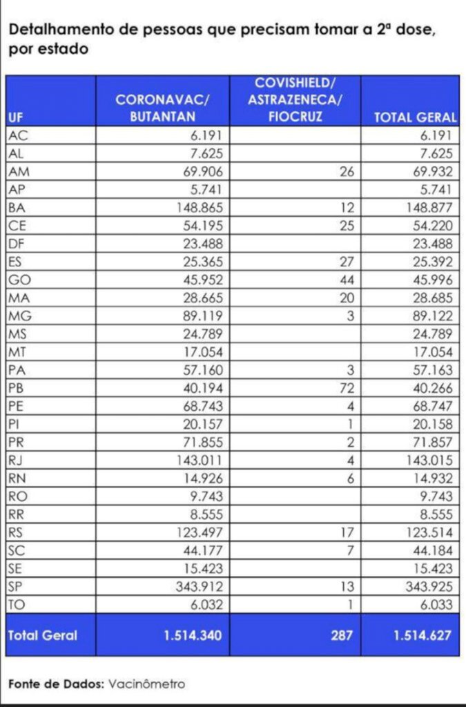 Os estados com menos doses em atraso são Amapá (5.741), Tocantins (6.033), Acre (6.191), Alagoas (7.625) e Roraima (8.555).Segundo o ministro, mesmo quem perdeu o prazo previsto no cronograma de vacinação deve procurar uma unidade de saúde para regularizar a situação.A grande maioria dos atrasos está em doses da vacina CoronaVac, desenvolvida pela farmacêutica chinesa Sinovac em parceria com o Instituto Butantan.No total, 1.514.340 doses do imunizante estão em atraso, sendo 287 da Oxford/AstraZeneca, em parceria com a Fundação Oswaldo Cruz (Fiocruz).