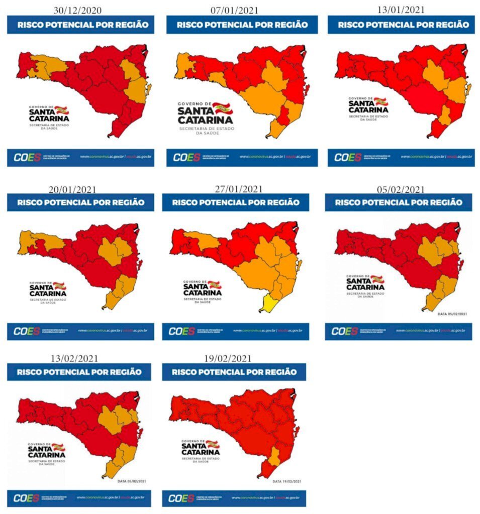 As regionais de saúde Meio-Oeste, Oeste, Alto Uruguai Catarinense, Nordeste, Planalto Norte e Alto Vale do Rio do Peixe estão há mais de 30 dias sendo classificadas com risco gravíssimo (vermelho).
