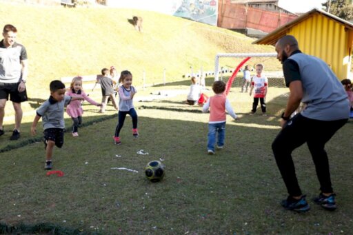 A demanda de Daniel foi atendida e o professor começou o processo para transformar um espaço de gramado do CEI em campinho - tudo isso engajando as crianças, mesmo que elas tenham apenas três e quatro anos. As turmas de maternal participaram da conversa com a diretora para solicitar o campo de futebol, escolheram o local ideal, demarcaram o campo e plantaram a grama.