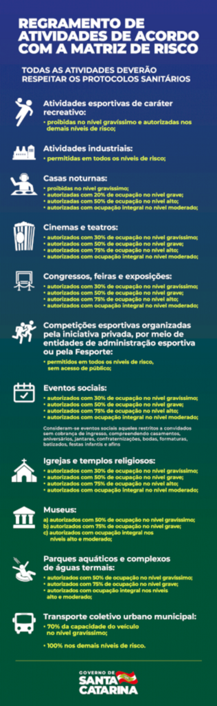O Governo do Estado editou novo decreto com regramento de atividades durante o período de enfrentamento ao coronavírus em Santa Catarina, incluindo eventos sociais, cinemas, teatros, parques temáticos e transporte coletivo. O texto, a ser publicado no Diário Oficial desta sexta-feira, 18, entra em vigor na próxima segunda-feira, 21, e tem validade até 28 de fevereiro de 2021.