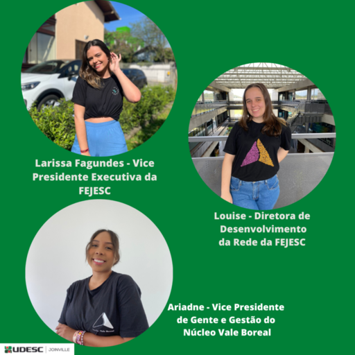 As estudantes já atuaram nas empresas juniores da Udesc Joinville em 2022. Larissa Fagundes, como presidente da Atrium Engenharia Junior, do curso de Engenharia Civil; Louise Mordhorst, diretora da Smart Consultoria Júnior; e Ariadne Jesus Onezio também fez parte do time da Smart Consultoria Jr, do Curso de Engenharia de Produção e Sistemas.