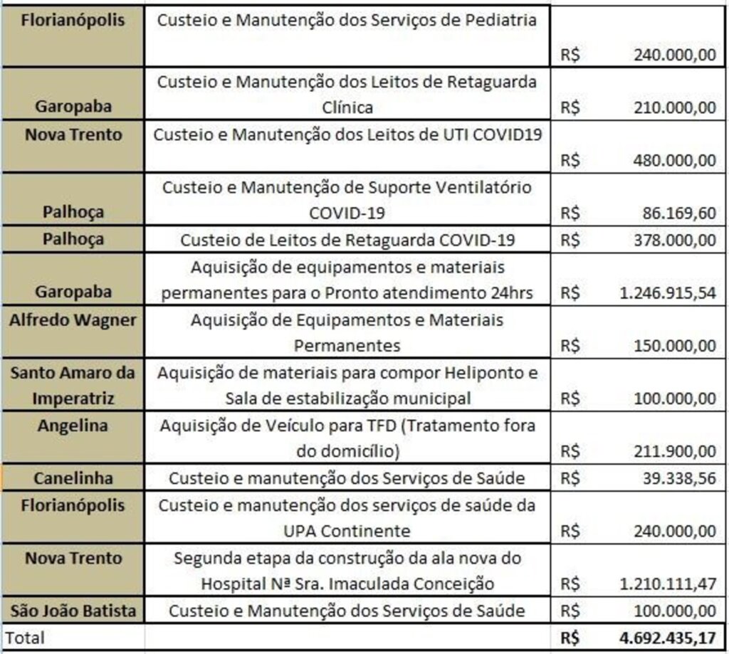 Fazendo um recorte de aplicação de convênios nos hospitais municipais da Grande Florianópolis, por exemplo, apenas em 2021 já foram repassados R$ 4.692.435,17, distribuídos da seguinte forma: