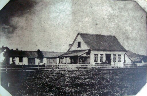 Foto cedida pelo Arquivo Histórico de Joinville - Residência do Sr. Gustav Hasse, localizada da Rua do Príncipe. Está na varanda o Sr. Hasse, negociante, e esposa Elise Grossenbacher, nascida em Affoltern, Bern, na Suíça. A imagem pode ser de 1866